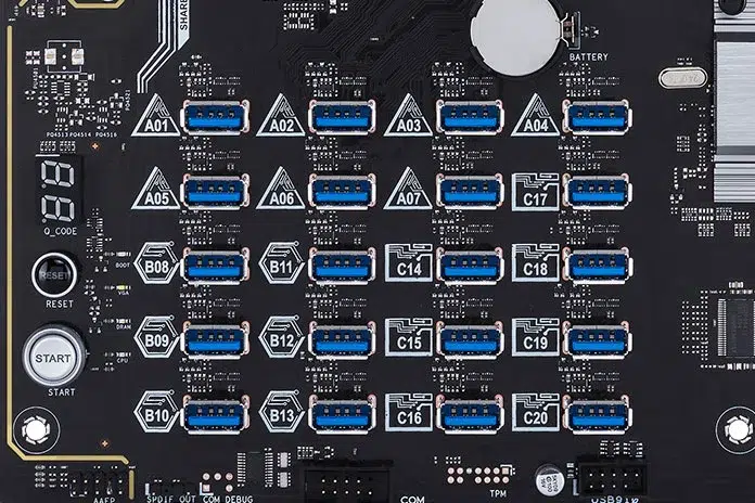 La estrella del conjunto son los 20 puertos verticales pensados para risers USB que llevan las líneas PCIe. Cada conector está identificado con su código, y esa nomenclatura se refleja en las pantallas de diagnóstico para que no haya pérdidas. A mayor número de GPUs, más necesitas orden; por eso la placa se preocupa de que la topología sea clara desde el minuto uno. Además, si trabajas con tarjetas gráficas de segunda mano, esta identificación facilita mucho las comprobaciones iniciales.