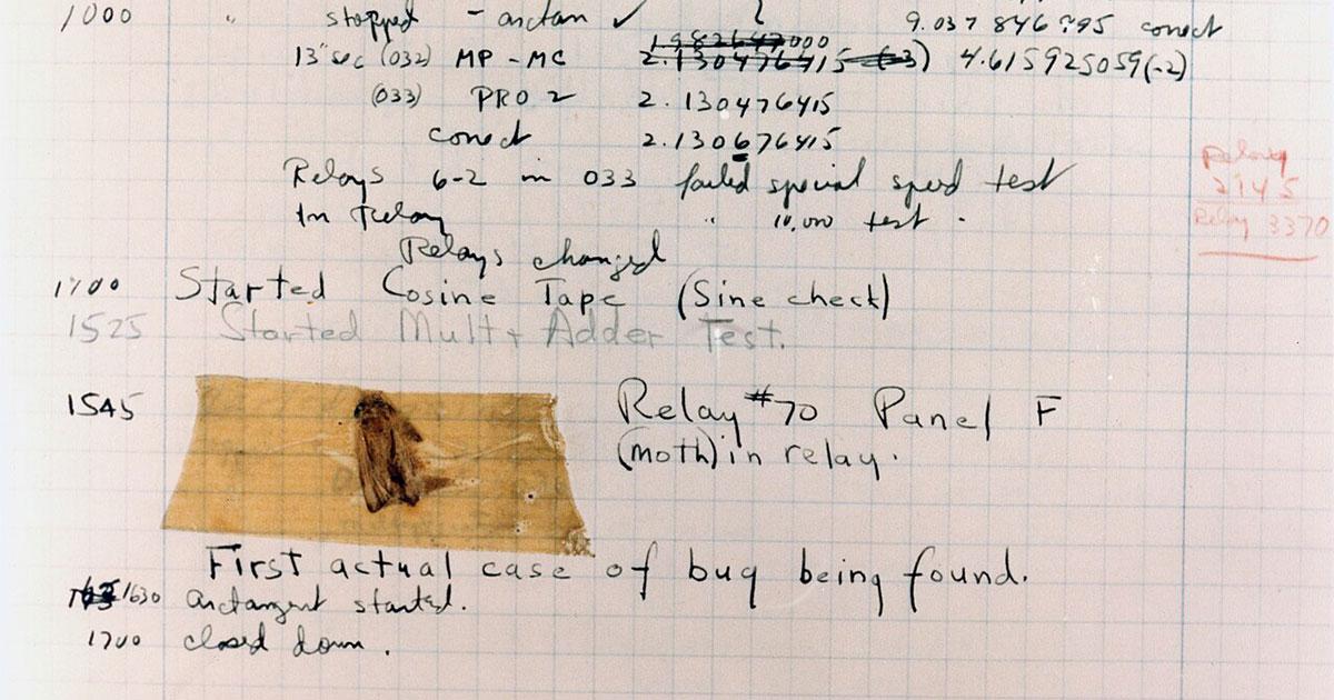 En 1947, los ingenieros que trabajaban en el ordenador Harvard Mark II se encontraron con un fallo muy peculiar. Al revisar los relés de la máquina detectaron que una polilla se había quedado atrapada en uno de ellos, provocando un error en el sistema. Registraron el hallazgo pegando la polilla en el libro de incidencias con una anotación: “first actual case of bug being found”.