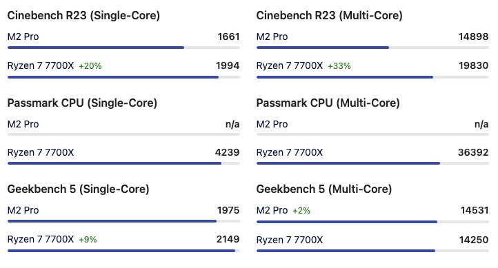 Si hacemos una comparativa rápida en cuanto al rendimiento, el M2 Pro se comporta bien al lado de las CPU modernas de Intel y AMD, pero no está batiendo récords. En todas las pruebas y benchmarks, funciona como una CPU de escritorio de rango medio-alto, como el Intel Core i5-13600K de Intel o el Ryzen 7 7700X de AMD.
