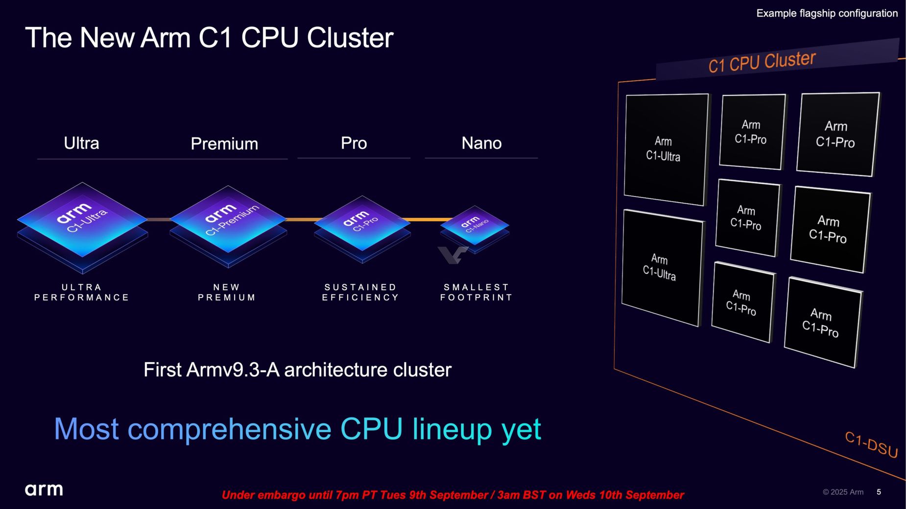 Los nuevos núcleos llegan con una nomenclatura más simple: C1-Ultra, C1-Premium, C1-Pro y C1-Nano, de mayor a menor rendimiento. Arm abandona así “Cortex” para ofrecer un esquema claro y escalable, con configuraciones mixtas en el mismo clúster y soporte de hasta 14 núcleos por SoC.