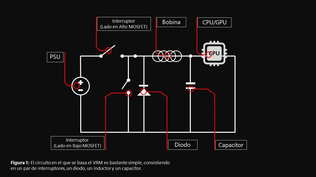 VRM significa Módulo Regulador de Voltaje y su misión es transformar la entrada de 12 V de la fuente de alimentación en los bajos voltajes limpios y estables que exigen CPU, memoria o GPU. Lo consigue con un convertidor reductor (buck) que alterna la conexión de la entrada mediante MOSFETs y “suaviza” el resultado con un inductor y un condensador.